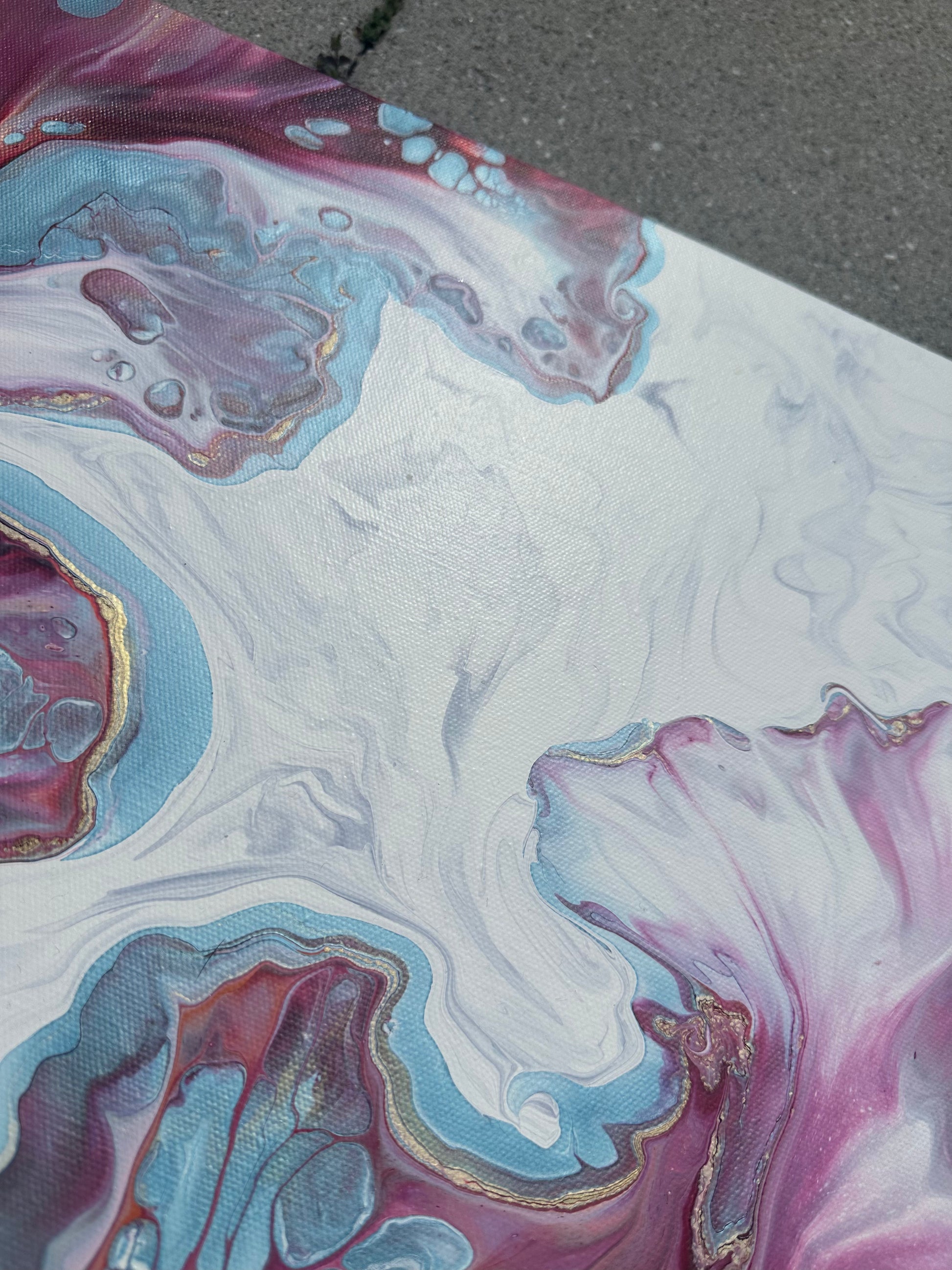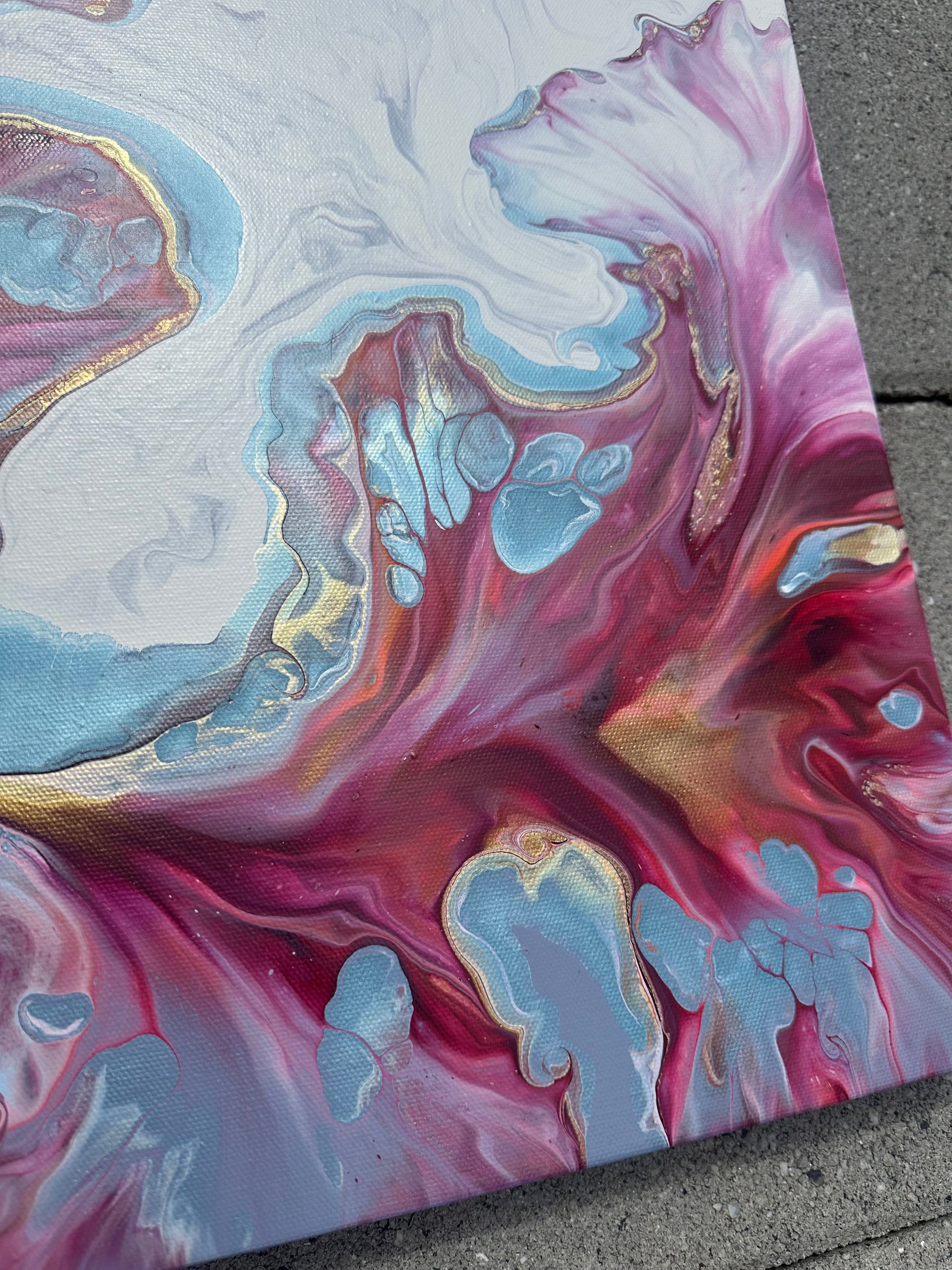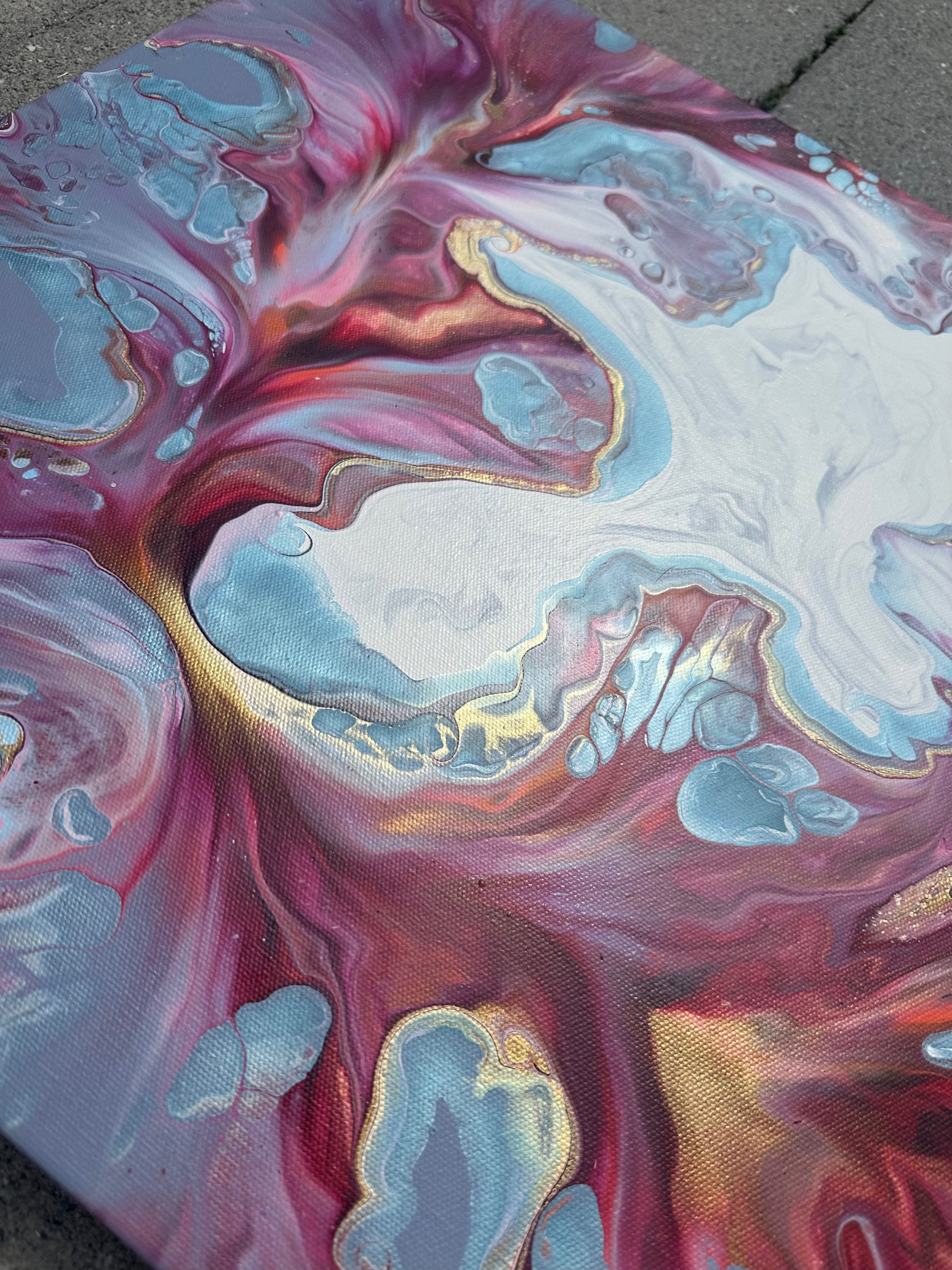 Cranberry Fields was made on a level 3 canvas. This piece is beyond beautiful. The cranberry red color is deep and vibrant and the grayish blue base looks incredible along side it. The marble base pattern brings so much elegance to this painting and definitely gives it a modern twist.