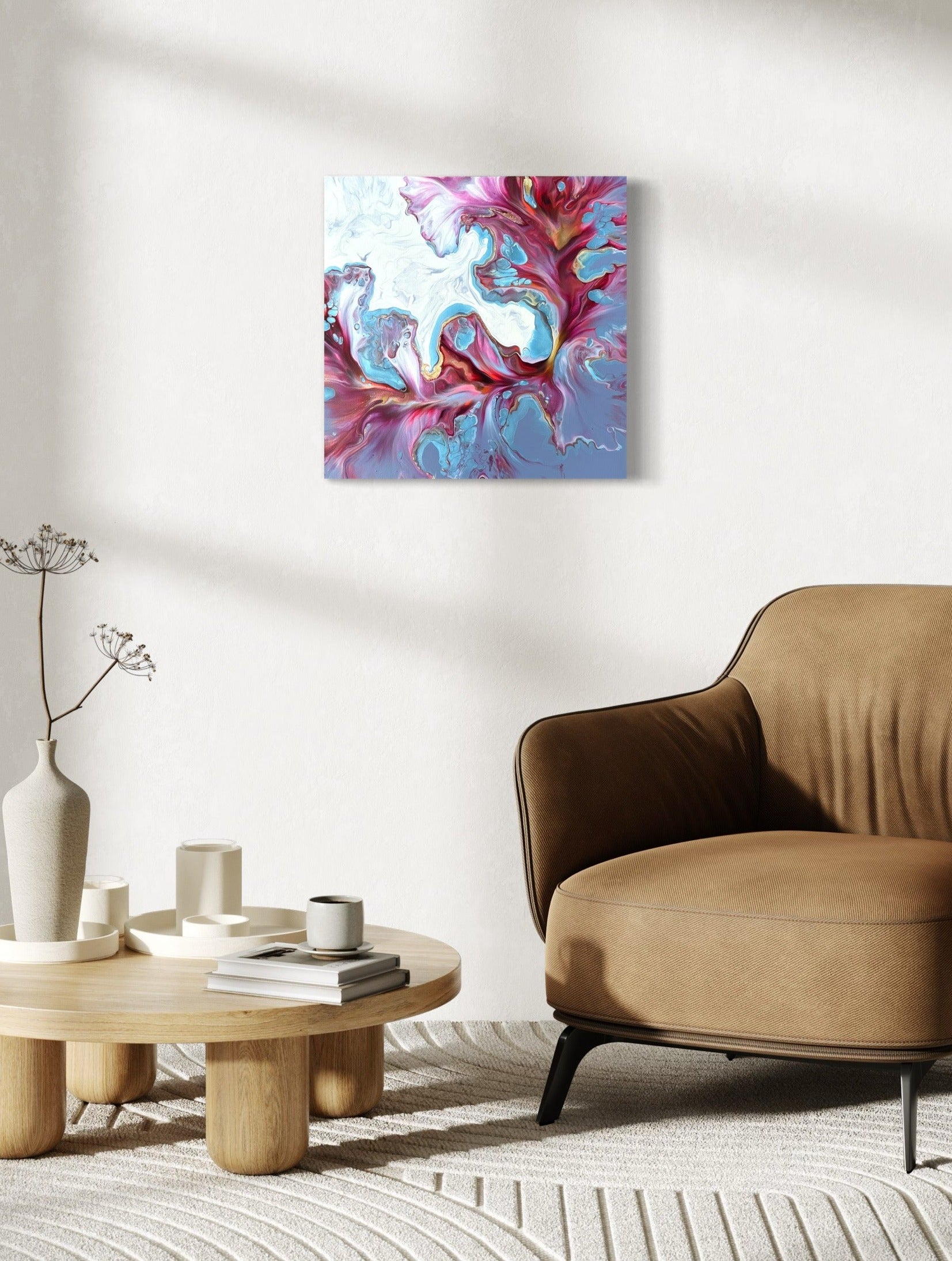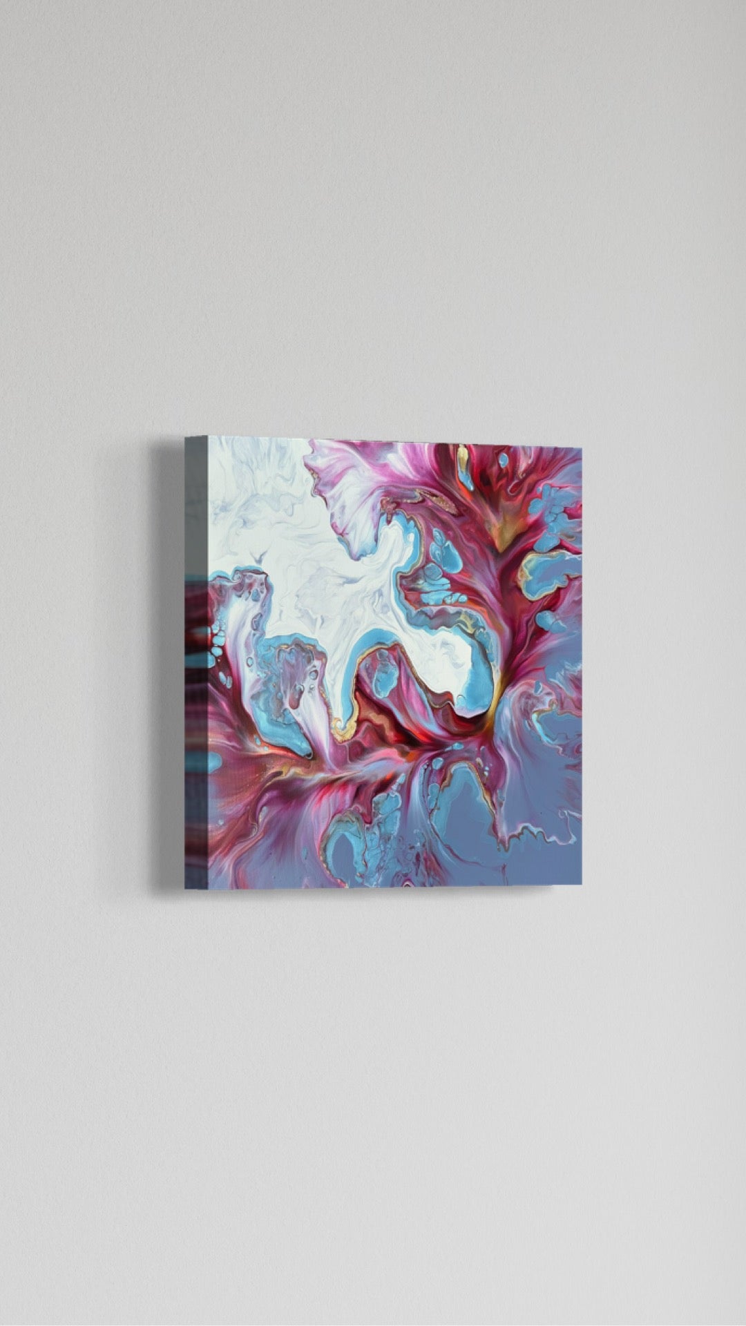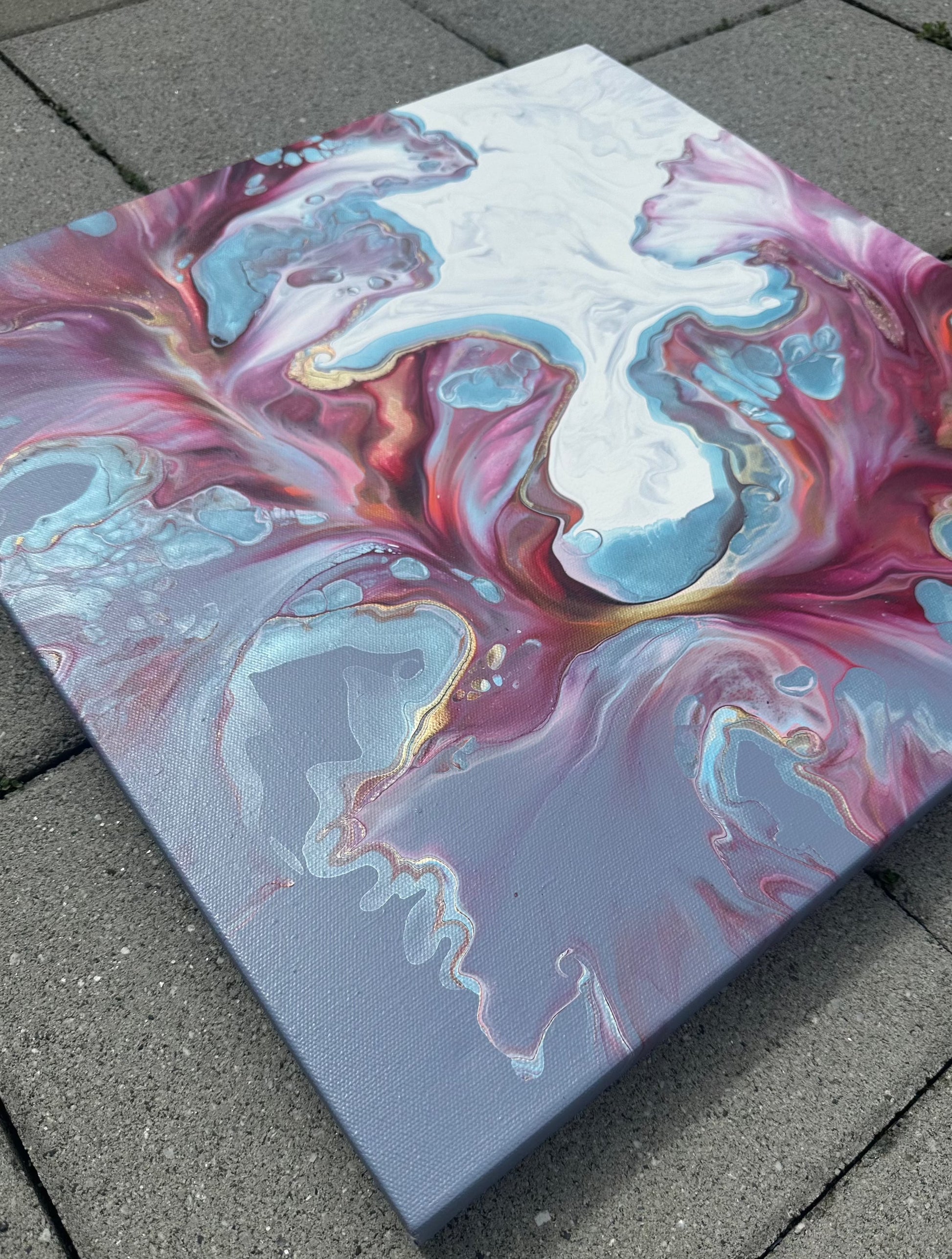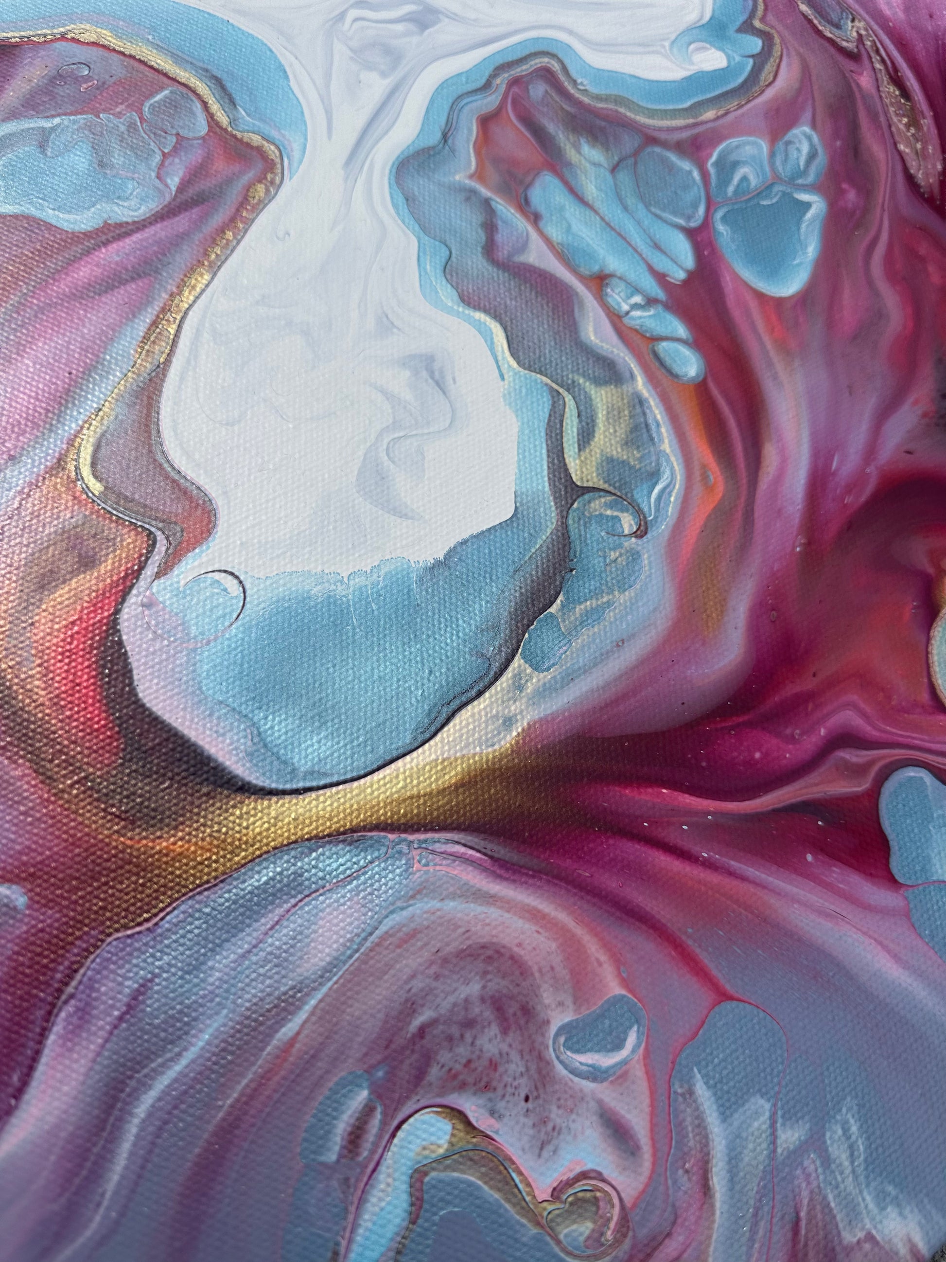 Cranberry Fields was made on a level 3 canvas. This piece is beyond beautiful. The cranberry red color is deep and vibrant and the grayish blue base looks incredible along side it. The marble base pattern brings so much elegance to this painting and definitely gives it a modern twist.